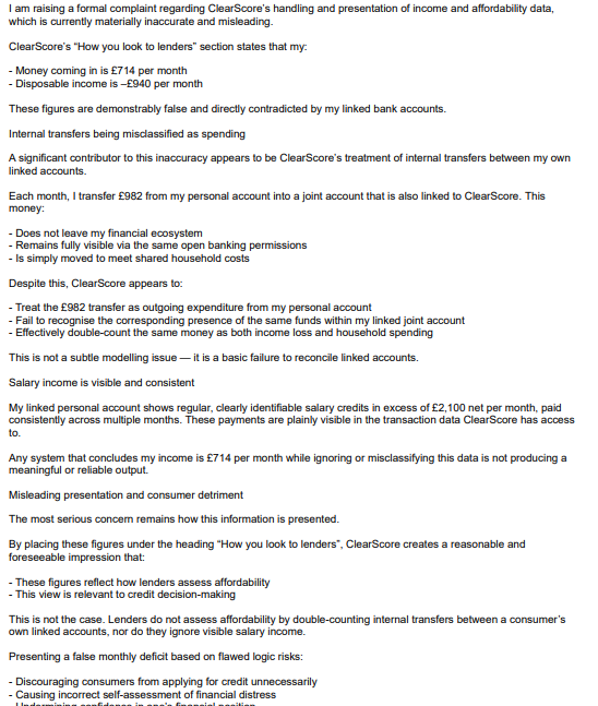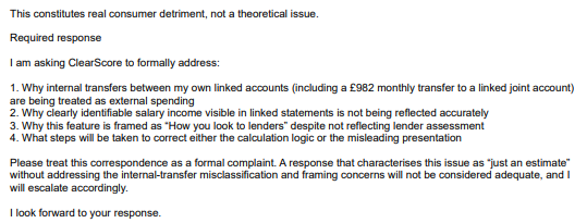 At the time of publication, this dispute is partially addressed. A formal complaint under ClearScore’s complaints procedure was upheld in full and the matter has been referred to the Financial Conduct Authority for intelligence purposes, and a reference number has been provided.